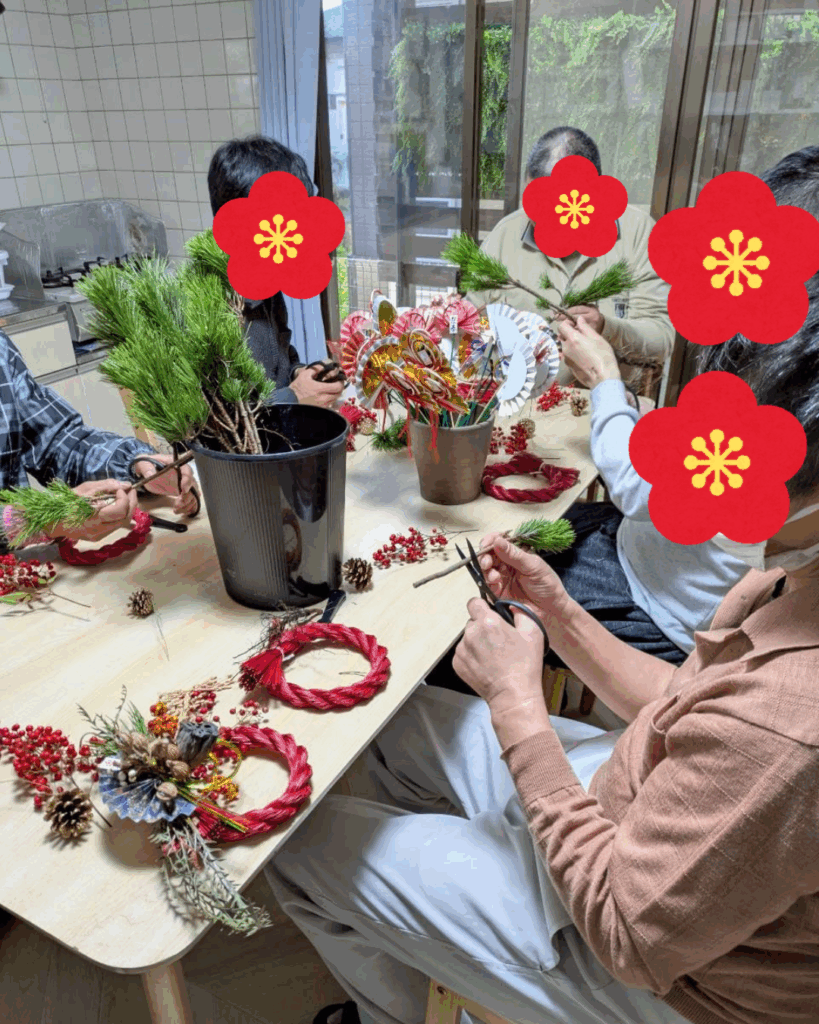 従来のわら色のしめ縄とは一味違う、洗練されたおしゃれなデザインに、利用者さんからも「わあ、おしゃれ!」「赤色が可愛いね」と歓声が上がりました。この赤いベースに、松や南天、金色の水引を組み合わせていくことで、まるでお店で売っているかのような高級感あふれる作品を目指しました。